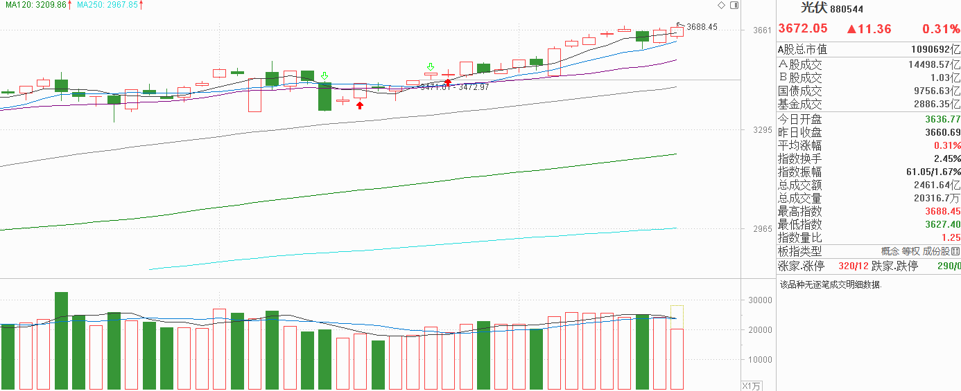 光伏的朋友们,都给我打起精神来!昨天中阳上涨把周三的探底回升中阴线反包,今天又是低开高走小阳反弹回到5天线上方并临近11月高点。连续两天光伏重心依然在5天线上方,而且10天线也很近,如果看突破的话,我认为下周出现新的高点是有概率的,如果不能新高,重新走弱10天线离当前位置并不远,回调空间也不大。从风险收益比看,光伏自11月5日大阳反弹后上行速度并不快,即使今天或下周选择突破,在突破后再跟着主力看好也不会吃亏,没有必要在要突破未突破的情况下选择方向,即使下方承接也较大。从细分赛道看,今天光伏产业表现一般没看出突破的信号,机器人、风电没走弱了但也没有反弹,储能有回调力度也不大,可整个光伏行业的重心是在上行的,中小微风格表现依然较强,而且轮动很快没章没法,要把握并不容易,我的观点是看趋势,光伏行业再创新高,细分赛道走强会是大概率,资金的流向就是热点的方向。