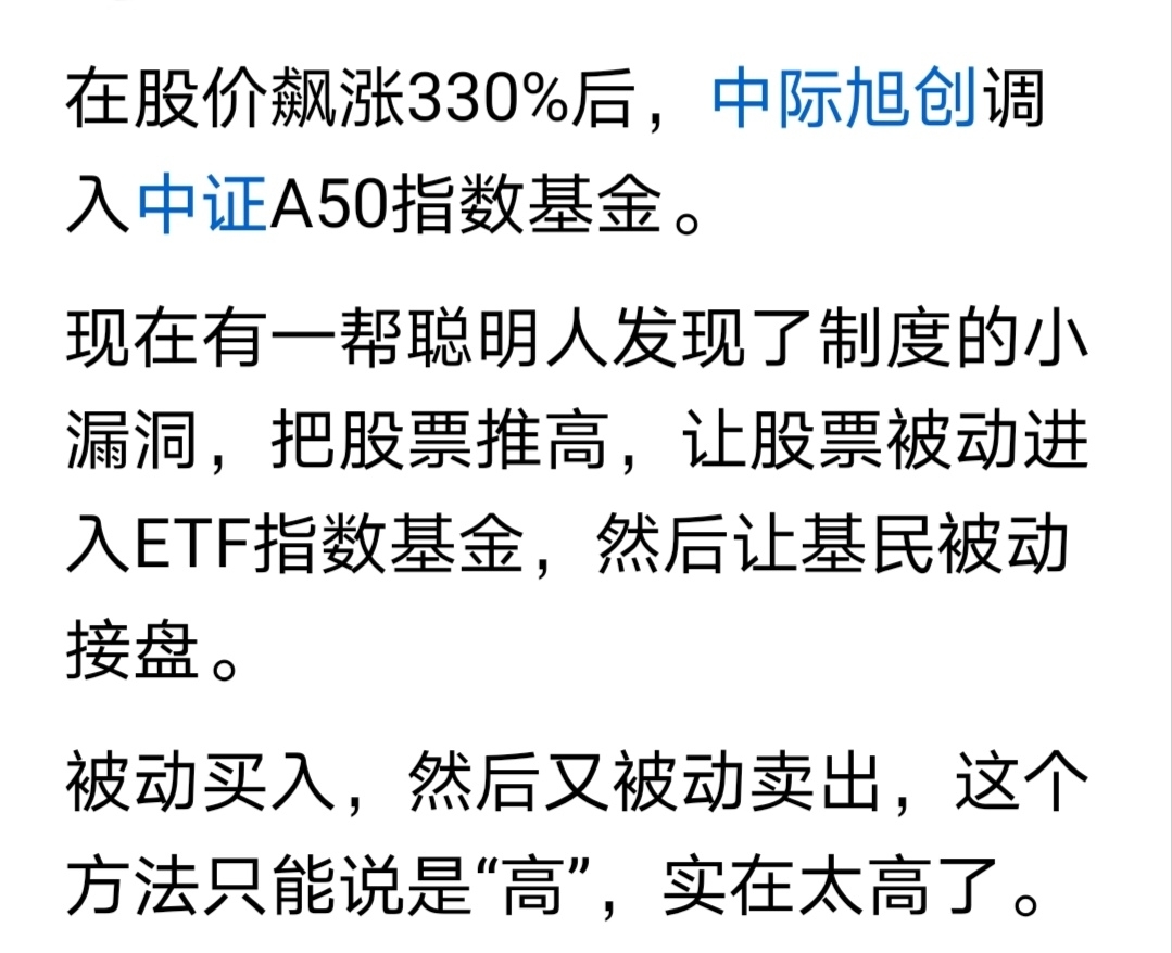 指数基金都是追涨杀跌,推高的股票无人接盘就纳入指数让基民被动接盘,比如中际旭创、寒武纪…,跌死了的剔出指数,比如德方纳米被剔出指数后翻倍了