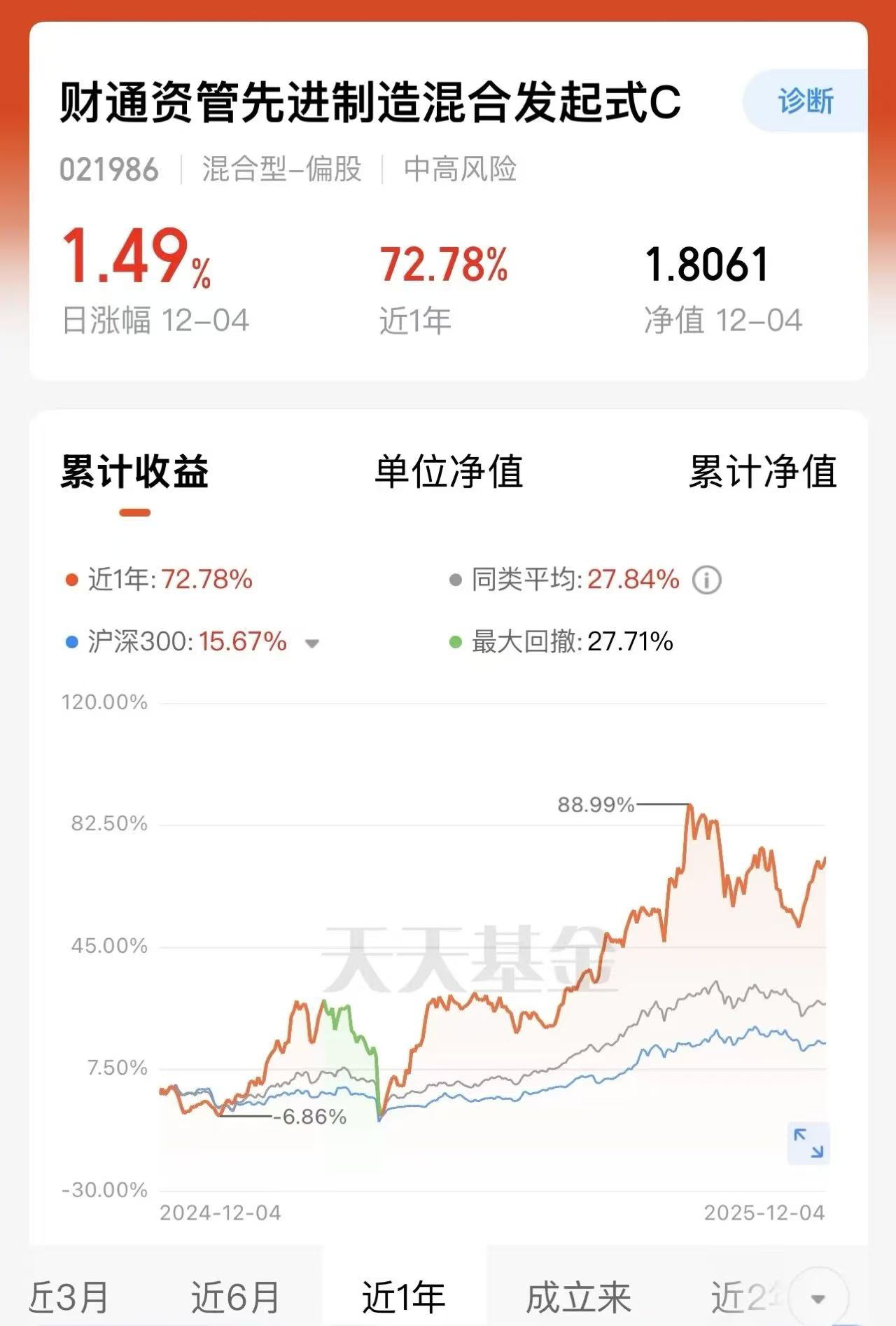 昨天聊,今天财通资管先进制造C就榜首。它近1年稳,产业高景气,资本涌入,这基地位