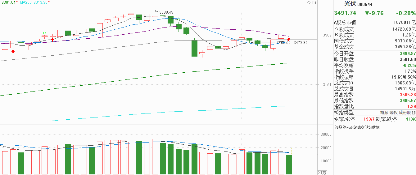 各位跟踪光伏的朋友,昨天小阳反弹刚好回到20天线,20天线因为光伏近一个月是回调的目前是拐头下压,今天下行惯性依然,如果光伏窄幅震荡的话,20天线算是被动突破了。可是今天光伏也走弱了,窄幅震荡还是贴着20天线,目前还不能说是企稳,尾盘一不留神回落又回被20天线反压。当前我觉得主力就应该要表态了,到底是企稳了还是反抽而已。因为企稳了光伏就能继续向上反弹,反抽就只会回到原点继续消化阻力。从细分赛道看,今天基本都在打酱油,光伏产业、机器人、储能、风电都是小幅走弱,微盘更弱一些,如果非得看合力的话,那就是资金小规模流出,更像是反抽到位的表现。往更长周期说,近期光伏的反弹更像是回补11月21号的跳空缺口,回补缺口后有没有后续做多动力,目前是看不出来的,当下行情偏弱,我会先防守起来。