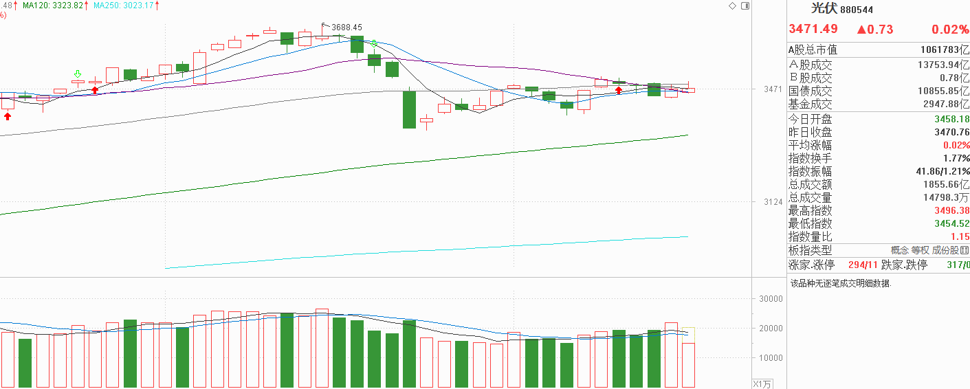 光伏上周五小阳反弹,刚好反弹至均线粘合的中位区,修复了上周四中阴线的一半,其实表现并不弱。今天20天线继续下行,光伏踩在20天线上方继续小阳走高收复60天线,看起来有点向上进攻的表现,但实际上市场重心并没有上移,虽然均线全部收复,但做多的信号并不明显。看细分赛道,今天储能表现比较强有资金流入,但机器人却是回调,光伏产业、风电、微盘都没有方向,与上周五的情况基本一样,是资金的分歧,未能形成市场合力,按这个情况看,今天即使收在60天线上方,说不定明天还会在均线粘合的区间内波动,这是没有方向的表现。我觉得不止光伏,很多题材也是这样的,代表当下没有新增资金流入,整体市场都在做无序波动,看涨感觉不对,看跌下行空间也不大,我也不知道这种行情什么时候结束,要么就痛痛快快的宽幅震荡,要么就选好方向顺势而为,现在这种情况我也不会,还是继续观望吧。
