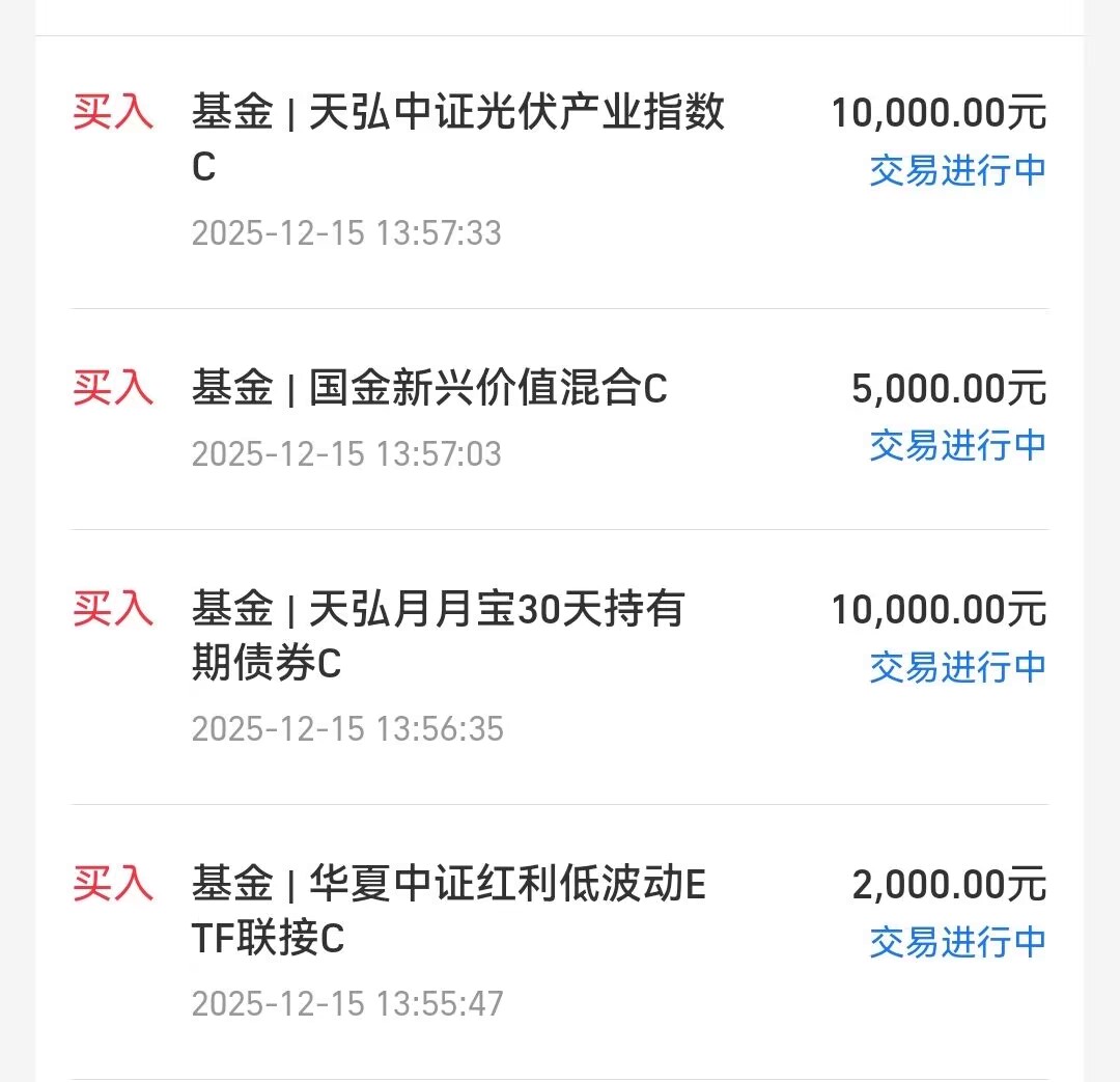 我今天加仓了光伏板块、国金新兴价值、天弘月月宝30天、中证红利低波,其它基金继续持有不动。