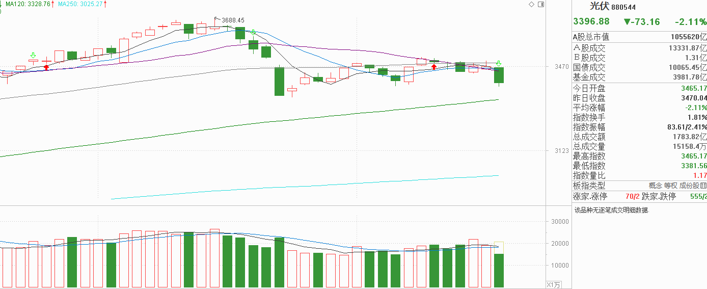 光伏昨天低开在20天线后还冲高至60天线,虽然有上影线,但60天线与20天线的界限并不明显,更像是多空平衡状态下的无序震荡,至于这根上影线是导致今天中阴调整的元凶,在技术上我认为并不对,今天光伏的走弱,更多是整个市场回调与细分赛道合力的结果。先说市场,今天基本就是单边走弱,并没有出现抵抗力量,题材走弱是大概率事情。细分赛道方面,自12月12号分析后,连续两天都是没有合力的分歧,上涨本身就很迷惑,我还以为是不是还有第六个影响光伏的因素,但很明显并不是,今天微盘的回调力度最大,影响了光伏行业的走弱。其实光伏与微盘本来就没有关系,但11月光伏行业创新高与微盘是同步的,因此现在微盘走弱,光伏走弱也是合理的。其它方向,今天储能、风电、机器人走得都很弱,光伏产业与微盘就更弱甚至是中阴调整,导致了合力是明显偏空的,这根中阴线是真实有较的,至少比近两天的小阳线靠谱。现在光伏明确走弱,那就要看抛压什么时候释放结束,暂时别看承接,因为抛压对光伏的影响更大一些,它们没出清前我认为企稳是有难度的。