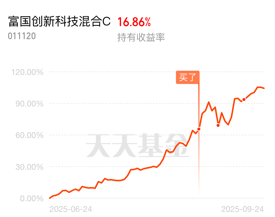 科技太强了,不管怎么追涨都能赚,$富国创新科技混合C$ 小羊8月底开始追涨,一个月收益就已经16.86%了,它重仓高成长性科技行业,例如电子、通信等,还有中际旭创等硬科技标的,今年的爆发力能不强嘛,而且它交易积极,调仓较为灵活,不断根据行情及时调整,这样也能不断跟上行情,基金经理的调仓肯定还是比我们普通人强的,这才有一年134%的超额收益,一年翻1.3倍,小羊追涨也能吃肉,继续持有,一分不卖,后续还要考虑补仓。