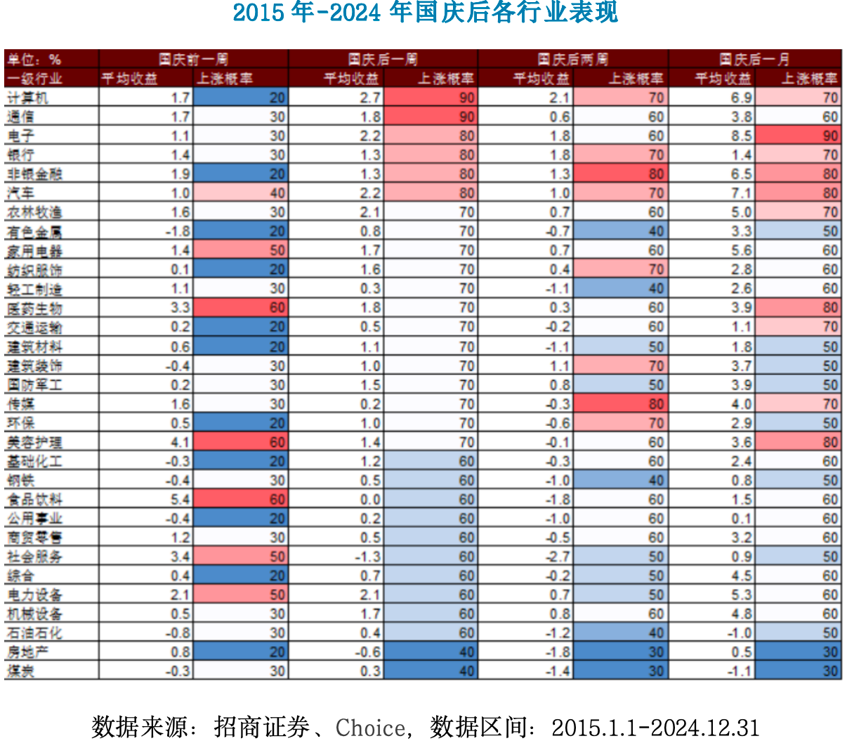 当前多家机构普遍认为,经过9月份的震荡整理后,市场有望重新回到上行通道。从历史数据来看,节后5个交易日的上涨概率也整体较高,达到60%。从行业板块来看,国庆后一周一级行业上涨概率多数在50%以上,其中上涨概率靠前的行业集中在计算机、通信、电子等新兴科技行业。