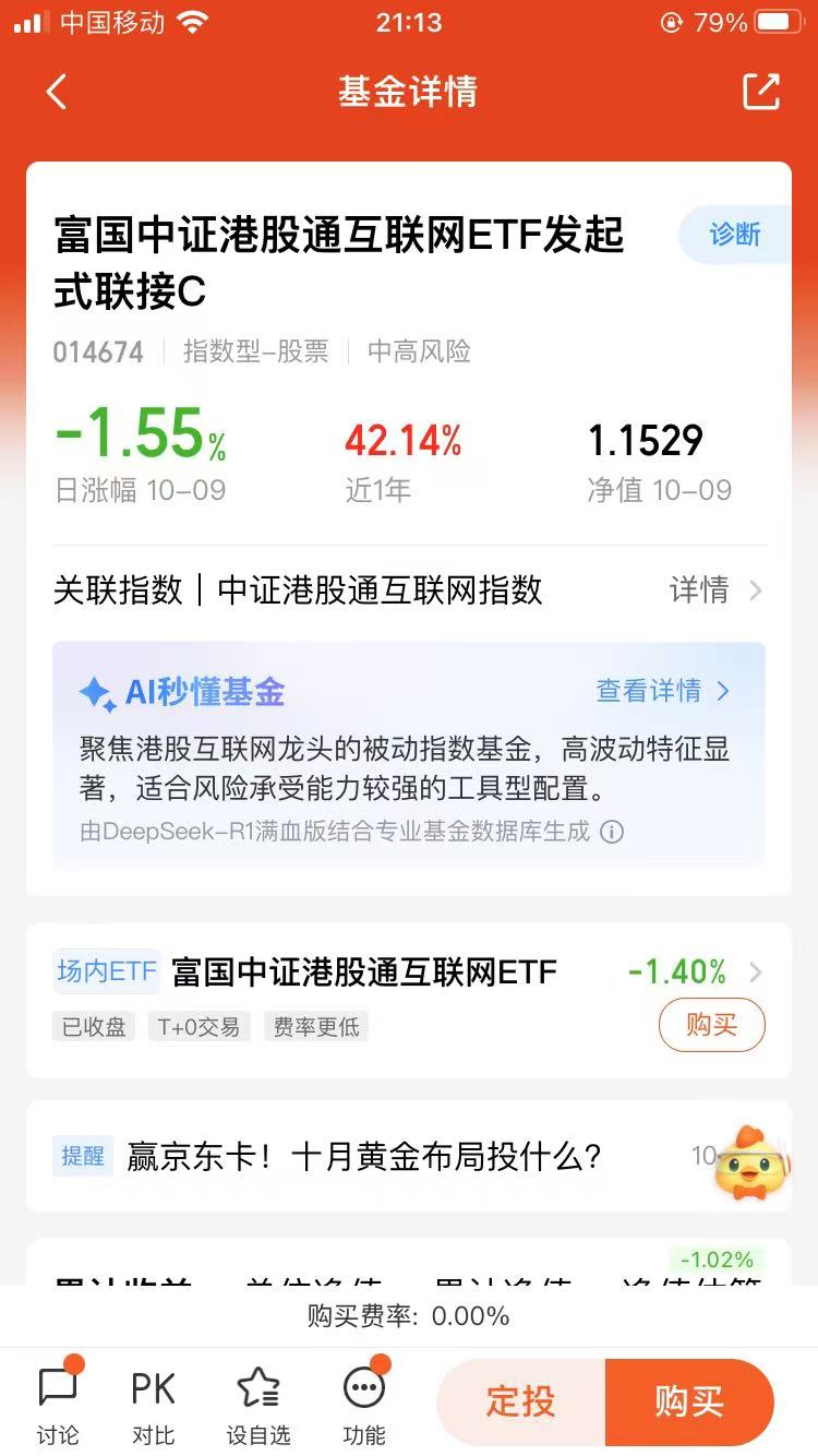 反观港股互联网,虽然政策从 “规范” 转成 “支持创新”,腾讯的云业务、阿里的云计算都有起色,但总觉得少了点爆发力。这些巨头盘子太大,增长速度摆在那,就算估值低、股息稳,想在年底冲一波高收益难度不小。硬科技倒是有国产替代的刚需,中芯国际 14nm 产能都满了,技术突破也挺振奋人心,但这赛道太考验技术判断力,而且波动实在太大,手里留两成仓位跟着就行,不敢放太多。$富国中证港股通互联网ETF发起式联接C(OTCFUND|014674)$