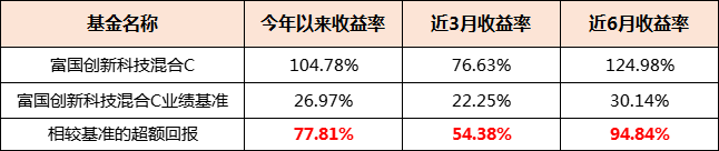 毕竟该基金进攻性太强,在今年的科技牛市中,富国创新科技混合C年内收益率104.78%,近6月回报124.98%,近3月回报76.63%,各阶段业绩远远超过同期基准。