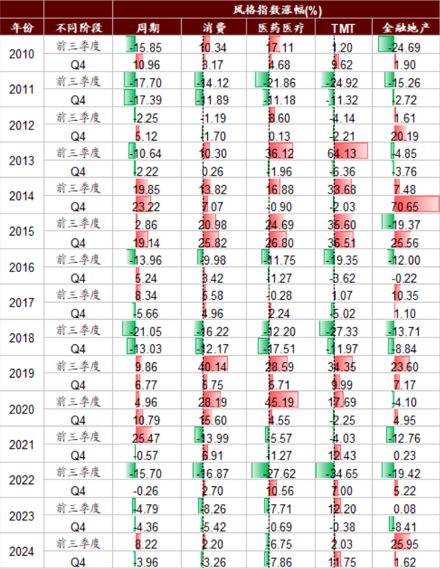 2、梳理过往15年(2010-2024年)发现,从行业风格来看,过往15年的四季度中,TMT表现最优出现5次,占比1/3。