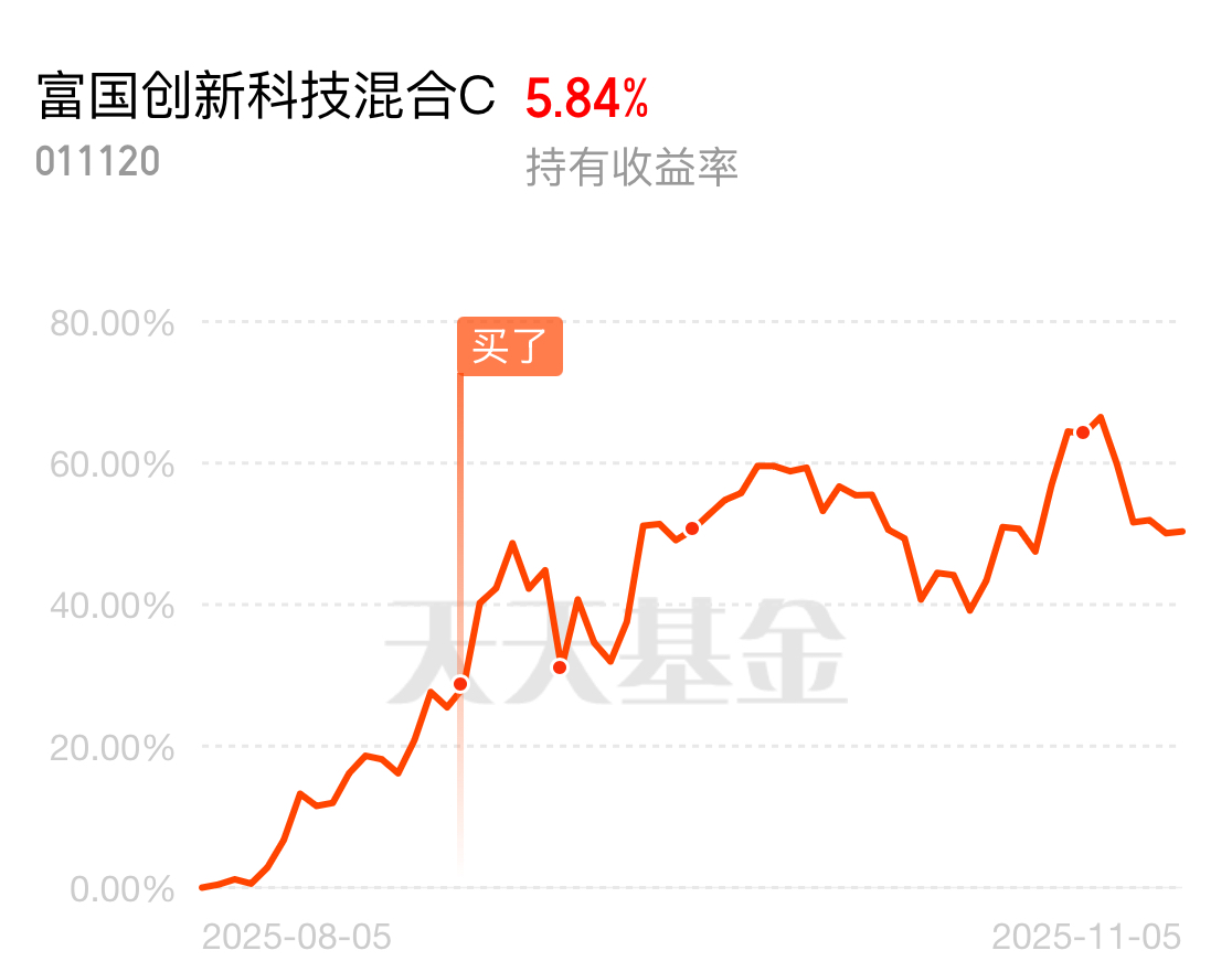 已经赢了!经过这一波回调还没有被甩下车的朋友们就已经赢了,今天科技方向领涨,半导体涨超3%,这一波洗盘非常成功,相信已经有很多人在下调中忍不住兑现跑路了,那么接下来就能更好的上涨了,小羊布局的$富国创新科技混合C$ ,目前收益还有5.84%,完美的抗住了这一波下调,其主要布局通信和电子领域,高成长性的同时高换手率,决定了它能在这轮动行情中及时捕捉市场风向和赛道轮动机会,保证长线的超额收益,近6个月涨幅115.85%,可见其持仓非常优秀,目前回调结束,接下来又是吃肉行情了,我们拭目以待。