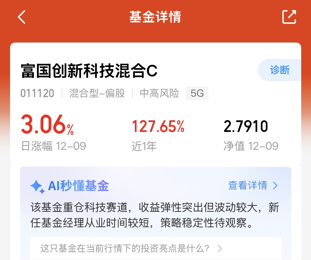 宝子们,当前科技产业政策持续加码,市场资金向高成长性科技领域集中,我关注的$富国创新科技混合C$ 它聚焦创新科技主题,股票投资占比60%-95%,其中80%以上非现金资产投向科技创新、技术研发等相关企业,精准覆盖TMT等核心赛道。经理罗擎任职期内收益已达73.58%,通过“自上而下”的资产配置与精选个股策略,兼顾成长潜力与风险控制。从长期表现看,近3个月收涨30.48%,近6个月收涨130.47%,大幅跑赢同类平均水平,超额收益显著,我继续看好!
