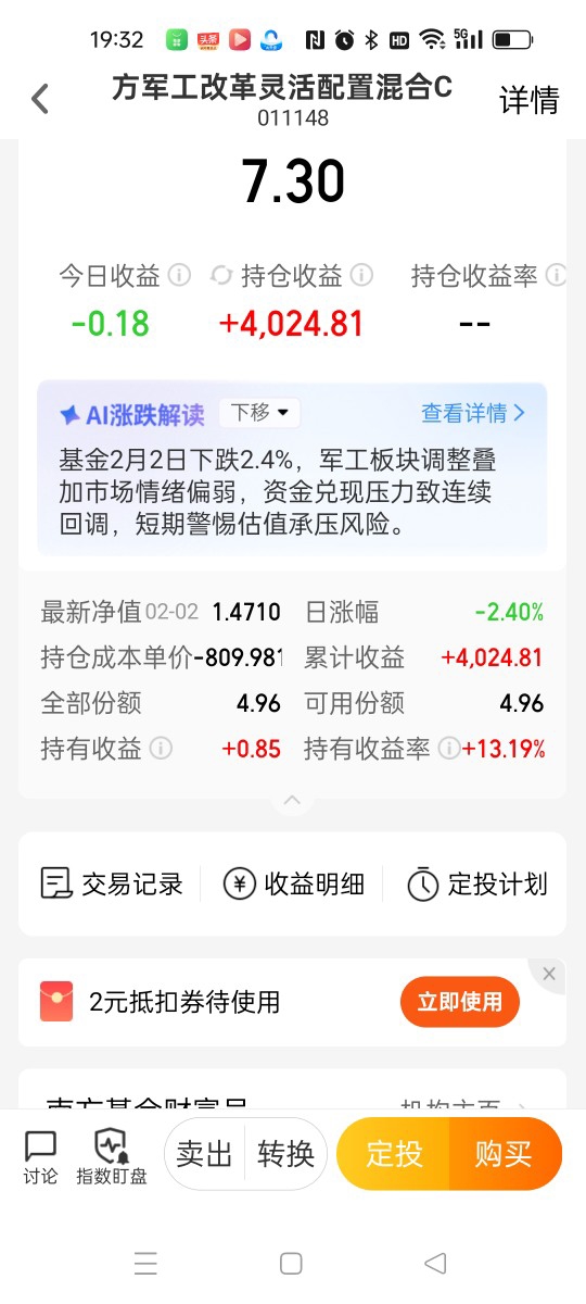 接下来我会把每个投资的基金,第一个是代码:011148$南方军工改革灵活配置混合$,我会截图来表达,比如哪个时间点抛的?啥价格抛售的?用啥方法出来的?现在今天是啥价格?总投资额度大致多少?这几年投资进去了几次?高抛低吸做过几次?赢利大约是多少?都给大家来参考一下。