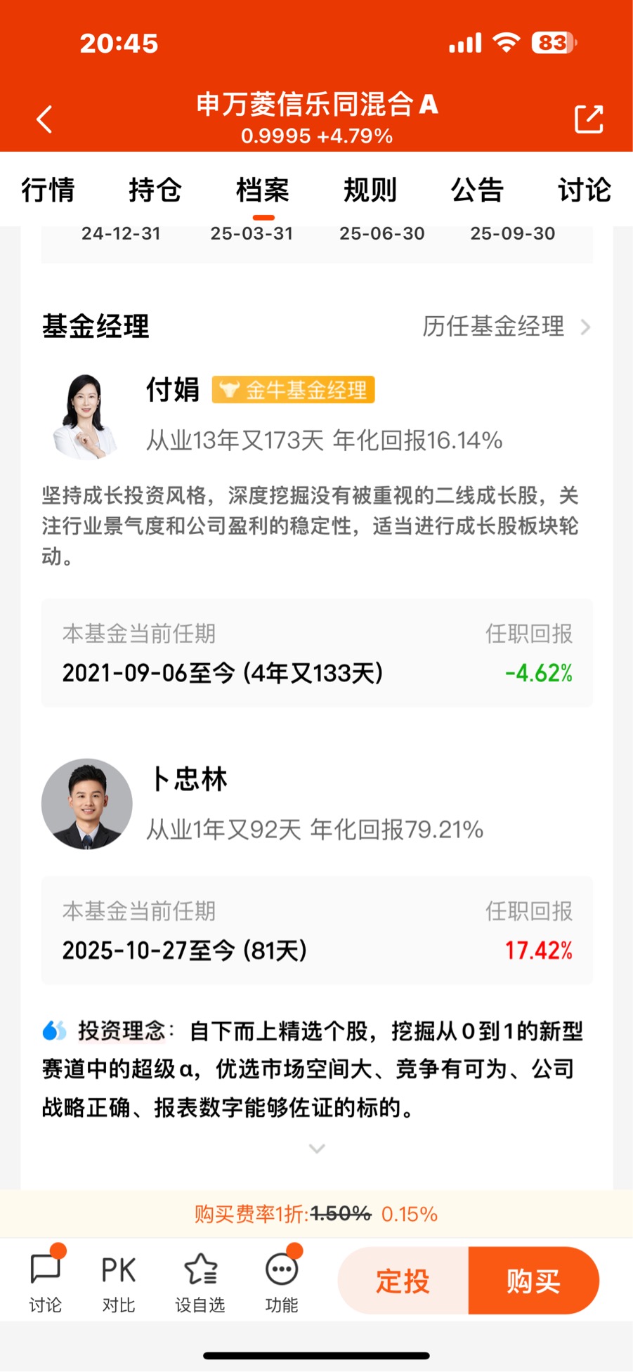 $银华心享一年持有期混合[011173]$ 强烈要求换基金经理,这俩人不行,浪费了大好行情,五年了还亏15个点,同时买入申万菱信的,换了经理这两个月也快回本了