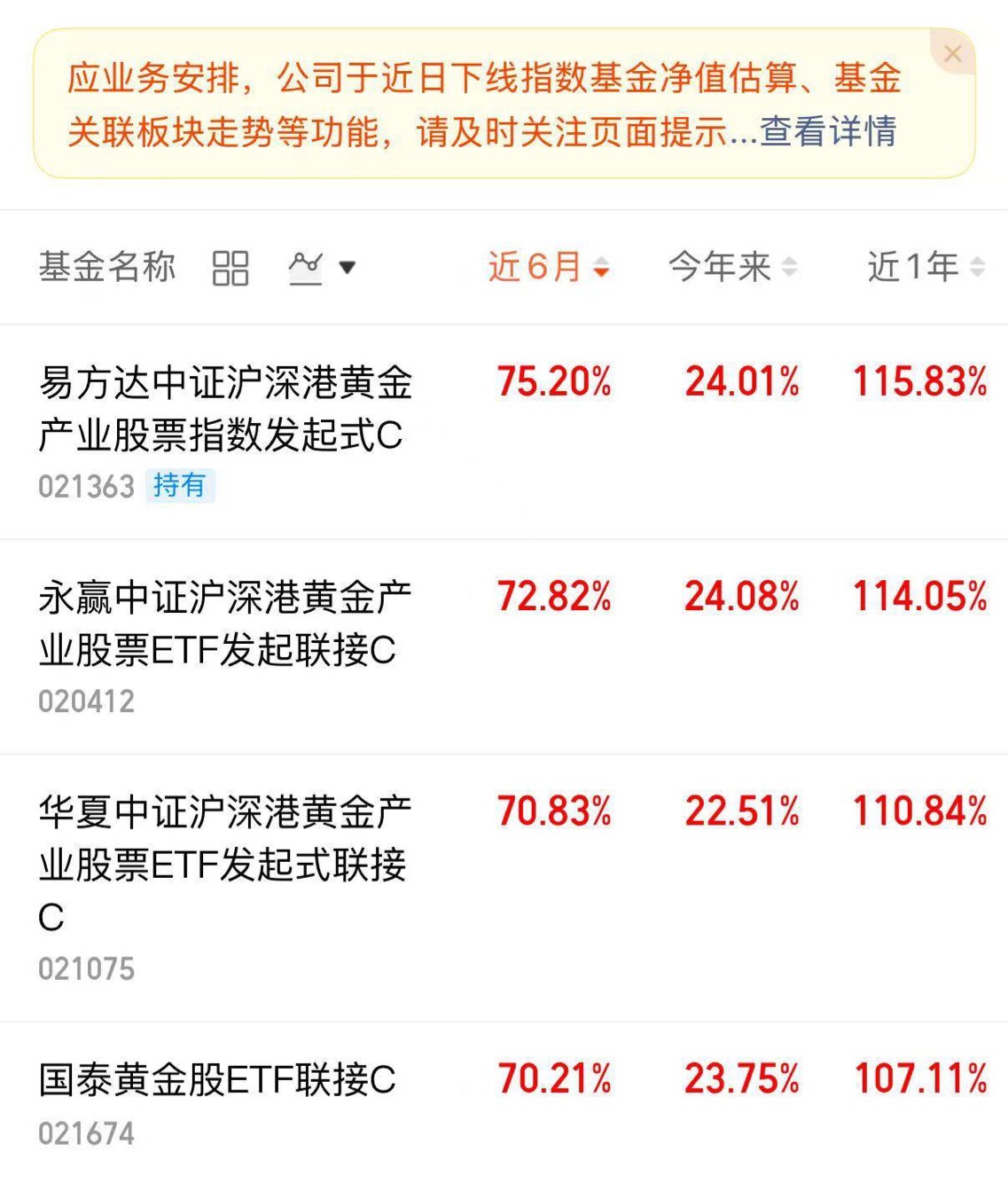 黄金市场的景气度一直在线,没什么大波动,黄金股更是跟着一路向上涨。易方达中证沪深港黄金产业股票 c 近六月涨幅 75.20%,位置刚刚好,我准备接着布局这只!