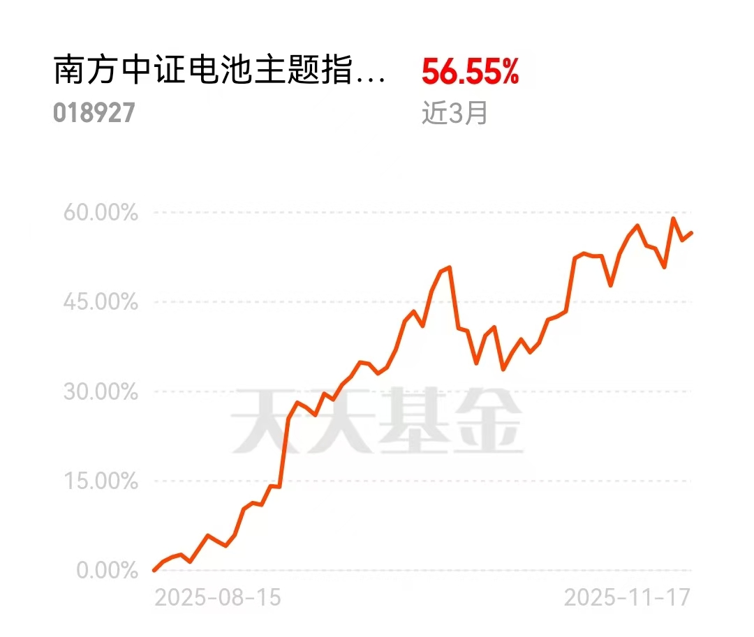别看新能源前两年灰头土脸,现在可是“政策+需求+技术”三重推力在点火。国家刚发文件推新能源集成融合,储能建设要加速,电池需求直接爆了。$南方中证电池主题指数发起A$(018926)跟踪中证电池指数,覆盖光伏、锂电、储能全链条,近三个月66%的涨幅已经说明一切。而且它固态电池相关权重高,未来电池技术突破,这基吃红利最直接。周期反转不是嘴上说说,是业绩走出来的——近一月15%、今年来75%,趋势线往上翘,拿稳就行。#今年买基金赚了多少钱?#