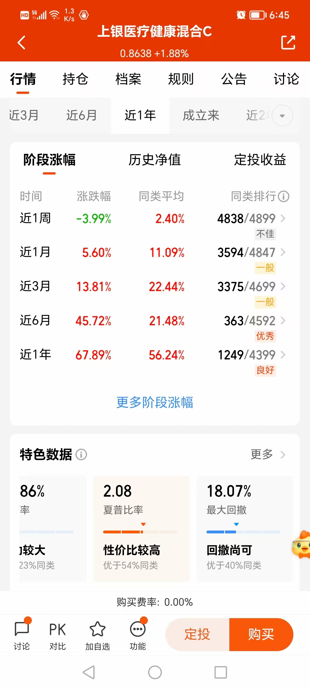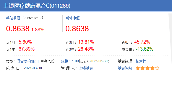 医药板块并不像科技板块那样,只需要概念就能驱动上涨,这个板块最大的门槛不是资金而是专业知识!面对当下的市场机遇与波动,科班出身比如医生、医药代表等亲自下场当然是可以的,可更多的投资者都是非专业人士嶉看个股名字和个股消息投资水很深,我自己也把握不住,那么选择一只靠谱的基金就很重要了。上银医疗健康混合C(011289)凭借其鲜明的特点和基金经理的专业能力,我认为在当前时点显得尤为合适。