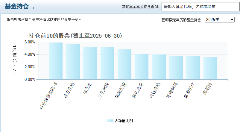 根据基金中期报告,上银医疗健康混合C的仓位中,创新药占比接近70%,是绝对的核心配置。此外,器械约占6%,医疗服务约占9%(科学服务、CXO这些与创新药产业链紧密相关的也算在内)。(数据来源:上银医疗健康混合基金中期报告)基金经理杨建楠坚定看好创新药的长周期机会,将大部分“弹药”集中投放在这个最具爆发力和确定性的主战场上。这就像打仗,把精锐部队都派往了战略要地。当创新药行情再起时,基金净值有望最直接、最充分地受益。
