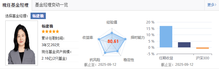 先给宝子们介绍嘉宾:杨建楠女士,上海交通大学生物医学工程学士,上海社科院产业经济学硕士;拥有 9 年从业经验,具备生物医学工程专业背景,长期接受医疗医药领域系统性学习。同时也拥有实体生物科技公司工作经历,能够从产业实体视角更深入地理解医药行业的发展逻辑与内在规律。历任上海天昊生物科技储备干部,长江证券分析师,建新资管研究员等职务,擅长产业趋势研究,逻辑思维能力强。2022年2月25日担任上银医疗健康混合C的基金经理,近6个月净值增长率45.72%,近1年净值增长率67.89%,现在基金资产规模有2.16亿(2只基金)。(截至2025-9-12 数据来源:天天基金)