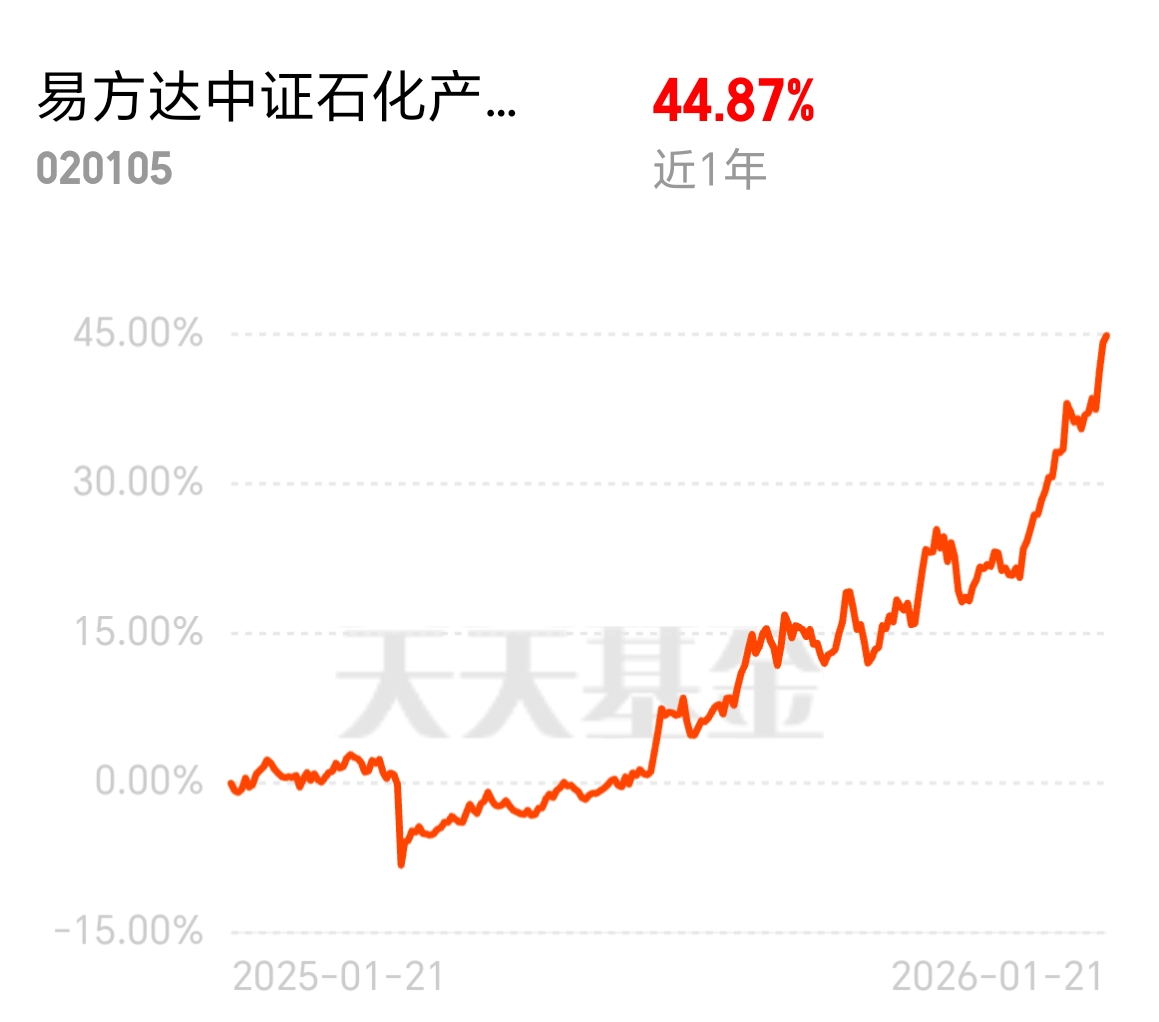 寒潮催化能源需求,国内供气企业满负荷运转,石油天然气领涨超应景,易方达中证石化产业 ETF 联接发起式 C 近 1 年 44.87%,三桶油 + 细分化工机会都想抓住,买石化产业赶热潮