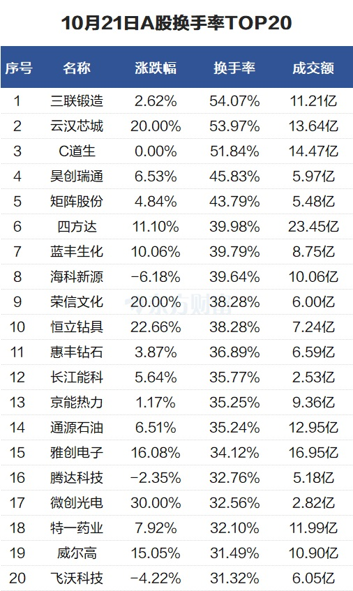 当天换手率最高的个股为三联锻造,全天换手率54.07%。云汉芯城紧随其后,全天换手率53.97%。
