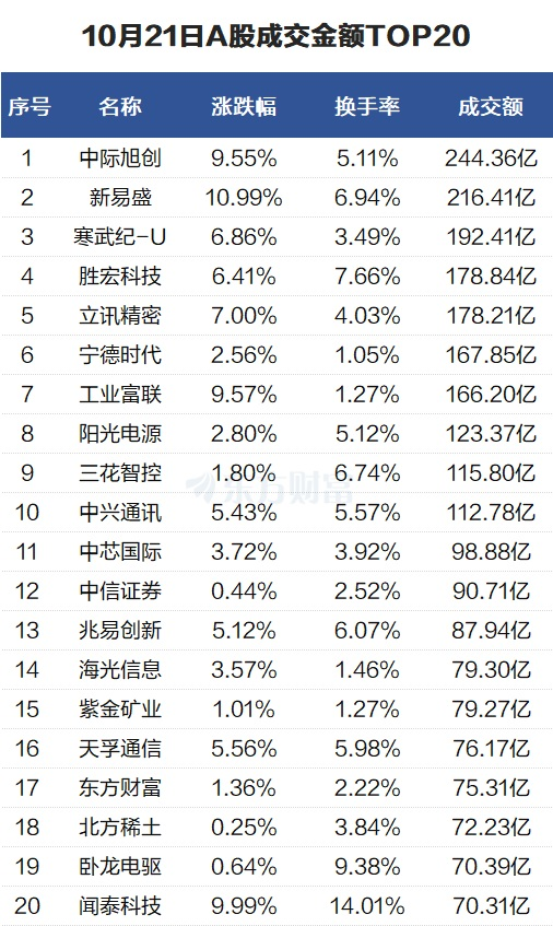 10月21日活跃个股:成交额top20/AI产业链股爆发/消费电子概念活跃!