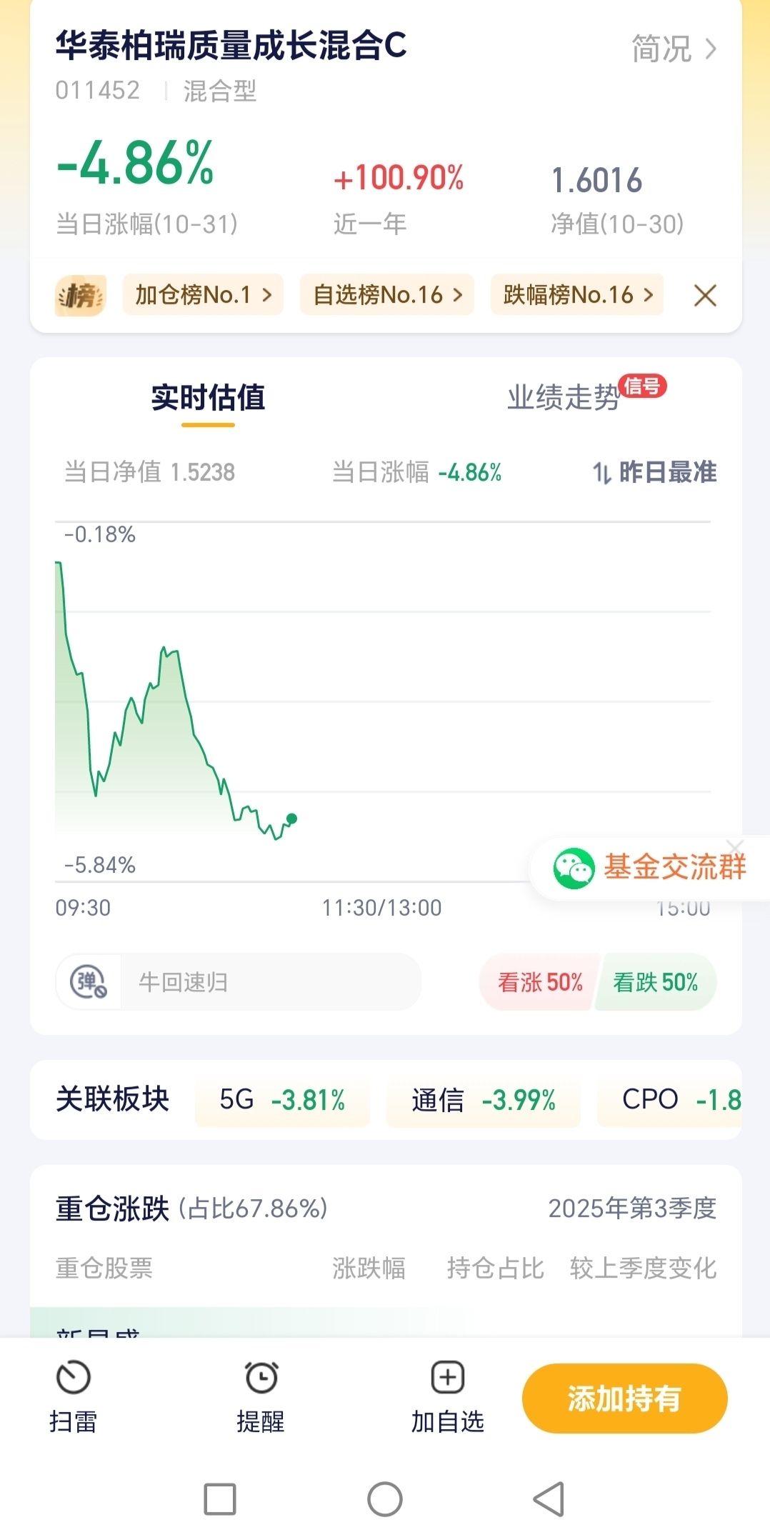 嘿,今天CPO跌了,华泰柏瑞也跟着跌了4.86%。但你要是看它近一年的成绩,那叫一个亮眼,直接翻倍!这种时候下跌就是机会,加仓进去,成本更低。要知道,好基不怕短期波动,就怕你不敢在低位布局。赶紧加仓华泰柏瑞,等着它后期给你惊喜!#飞天茅台批发价跌破1700!酒价何时触底?#
