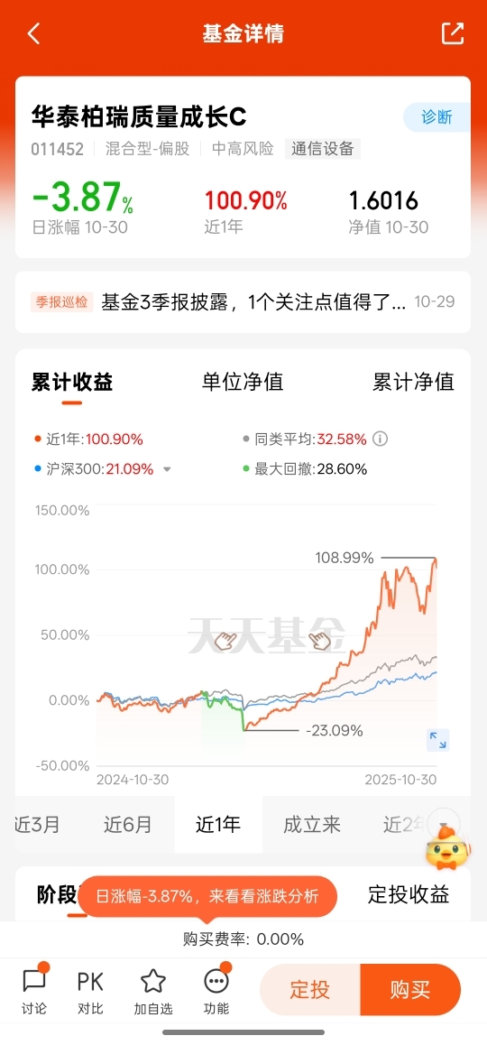 聊个实在的,今天CPO行情确实难看,相关的科技板块一片飘绿,光通信、通信设备这些跌幅都挺吓人的。但越是这种时候,越得稳住心态。我之前买的华泰柏瑞今天也跌了3.87%,身边有人劝我赶紧卖,我反而觉得可以加仓。这只基金一直强调质量成长,选的都是基本面不错的公司,短期跌是跟着市场走,但长期大概率能起来。补仓不是瞎补,得用3年以上用不上的闲钱,这样就算再跌也不用急着卖,能扛到行情回暖的时候。这才是投资的正确打开方式,别被短期波动带偏了。