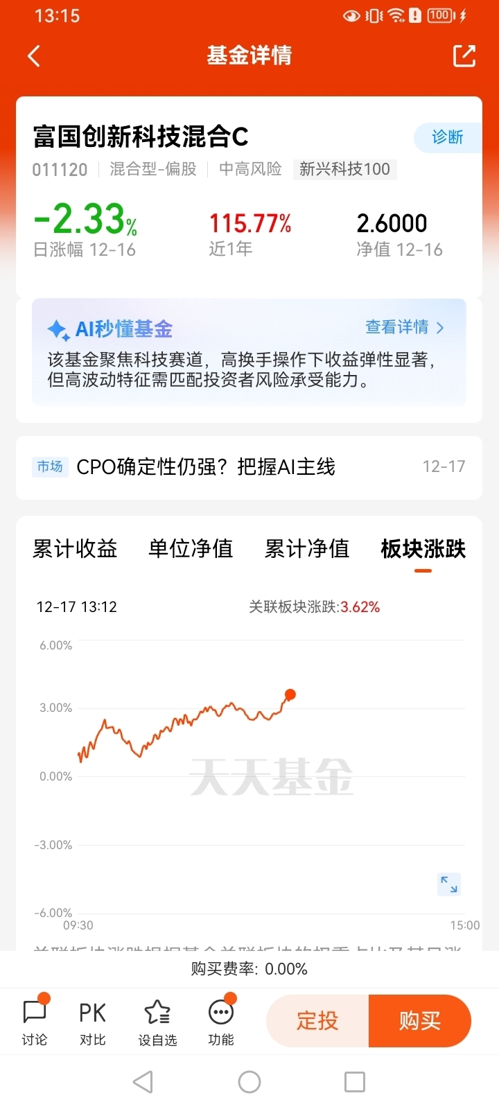 通信设备国产替代提速,富国创新科技现在估值3.62%。