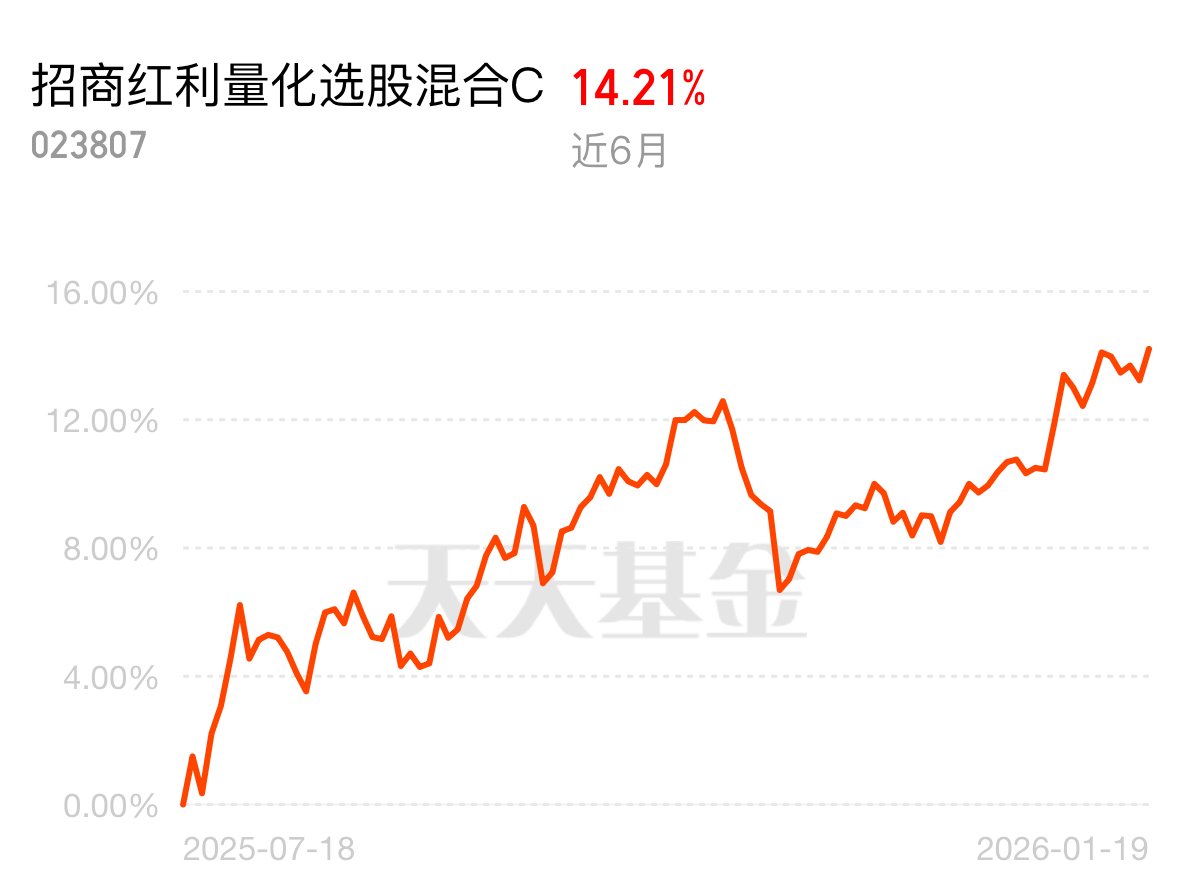 最近红利策略基金收益亮眼,量化选股更具优势,招商红利量化选股混合 C 表现不俗!近 6 月收益 14.21%,近三个月大幅跑赢,超额收益近 10%,今日估值也是红的,做底仓踏实又安心。$招商红利量化选股混合C$