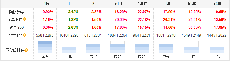 从历史业绩来看,近1周涨幅达到0.93%;近3月涨幅达到3.87%;近6月涨幅达到18.26%;近1年涨幅达到17.5%;近2年涨幅达到10.65%;近年来涨幅达到22.07%。