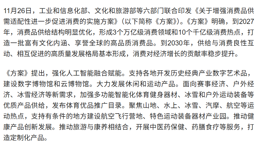 当前政策层面明确 “内需主导” 的发展方向,六部门联合发文促进消费升级,商务部也在培育旅居、体育赛事等消费新增长点,推动 “人工智能+消费” 深度融合,消费板块迎来政策红利密集期。