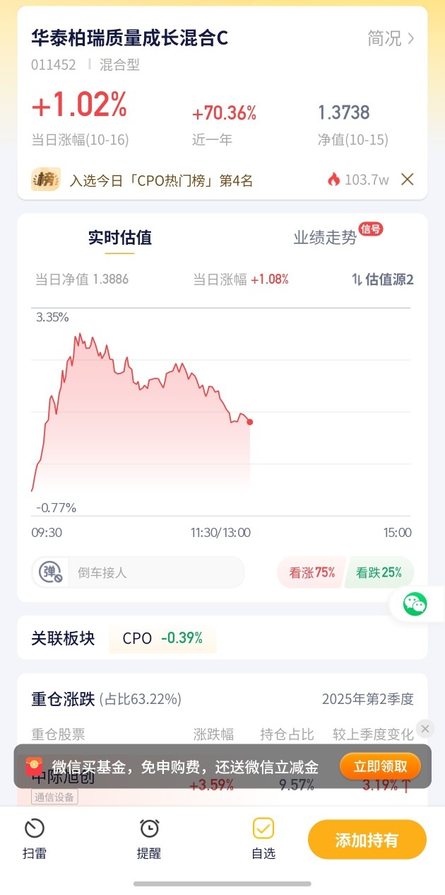 【华泰柏瑞质量成长混合C基金估值播报+10.16行情】今日估算涨幅+1.08%!