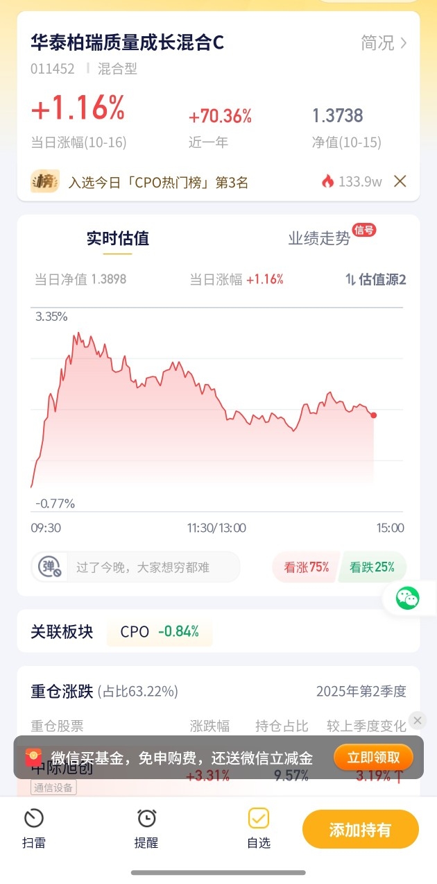 【华泰柏瑞质量成长混合C基金估值播报+10.16行情】华泰柏瑞质量成长混合C今日估算涨幅+1.16%!收益提前看+成长股板块今日势头不错2. 今日A股市场有点小波动,部分板块表现亮眼,也有些板块拖了后腿,投资还是得谨慎些。