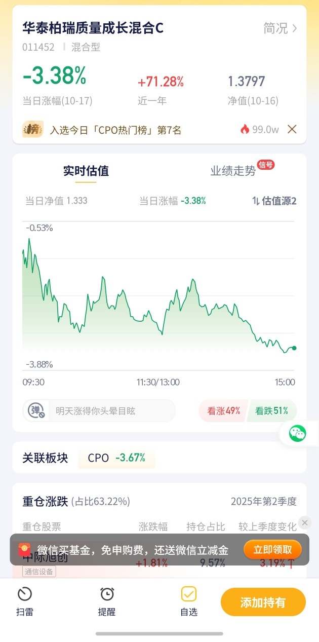 【华泰柏瑞质量成长混合C估值播报+10.17行情】今日预估跌幅-3.38%!收益提前看+质量成长风格回调. 今日A股新能源、半导体等板块下跌明显,债券基金略有涨幅,市场分化明显,投资的朋友得好好把握节奏。