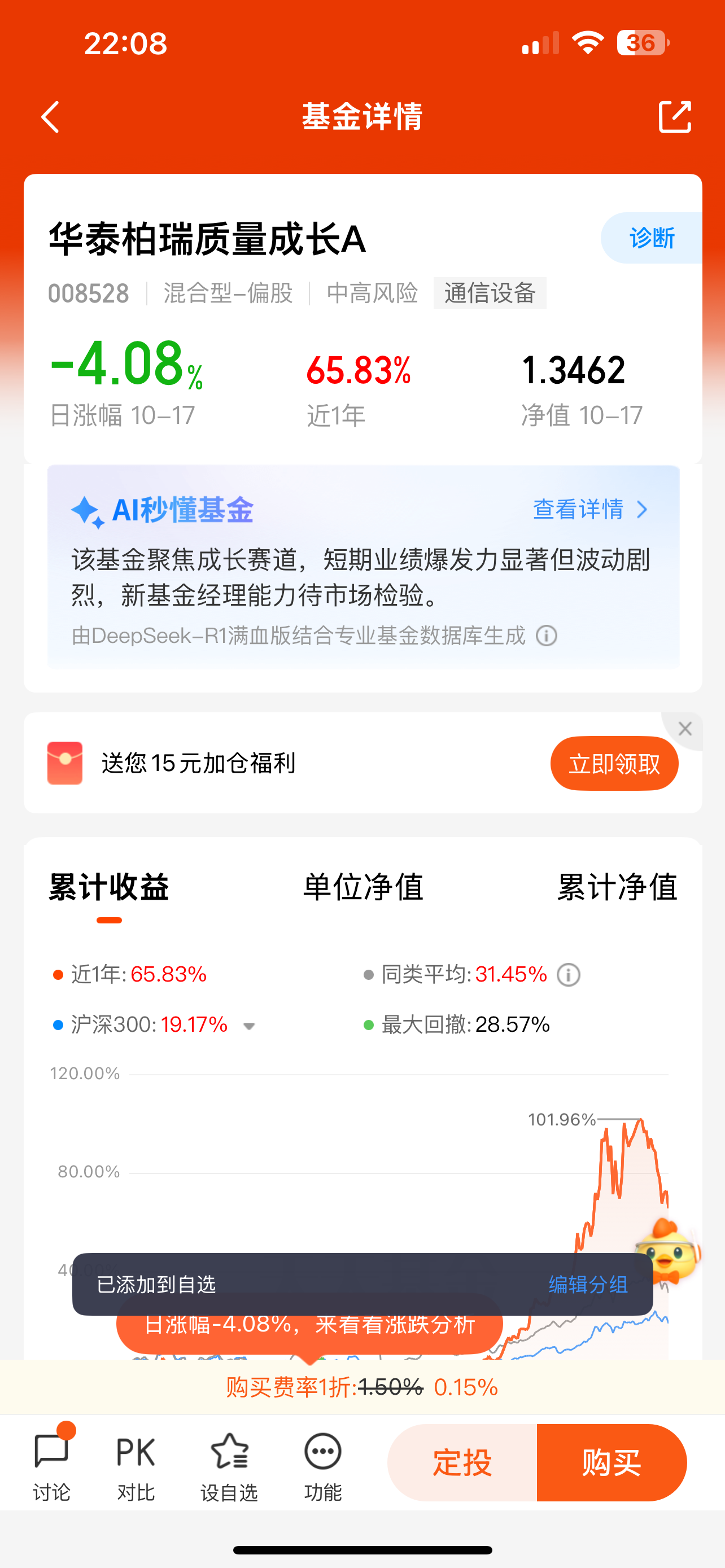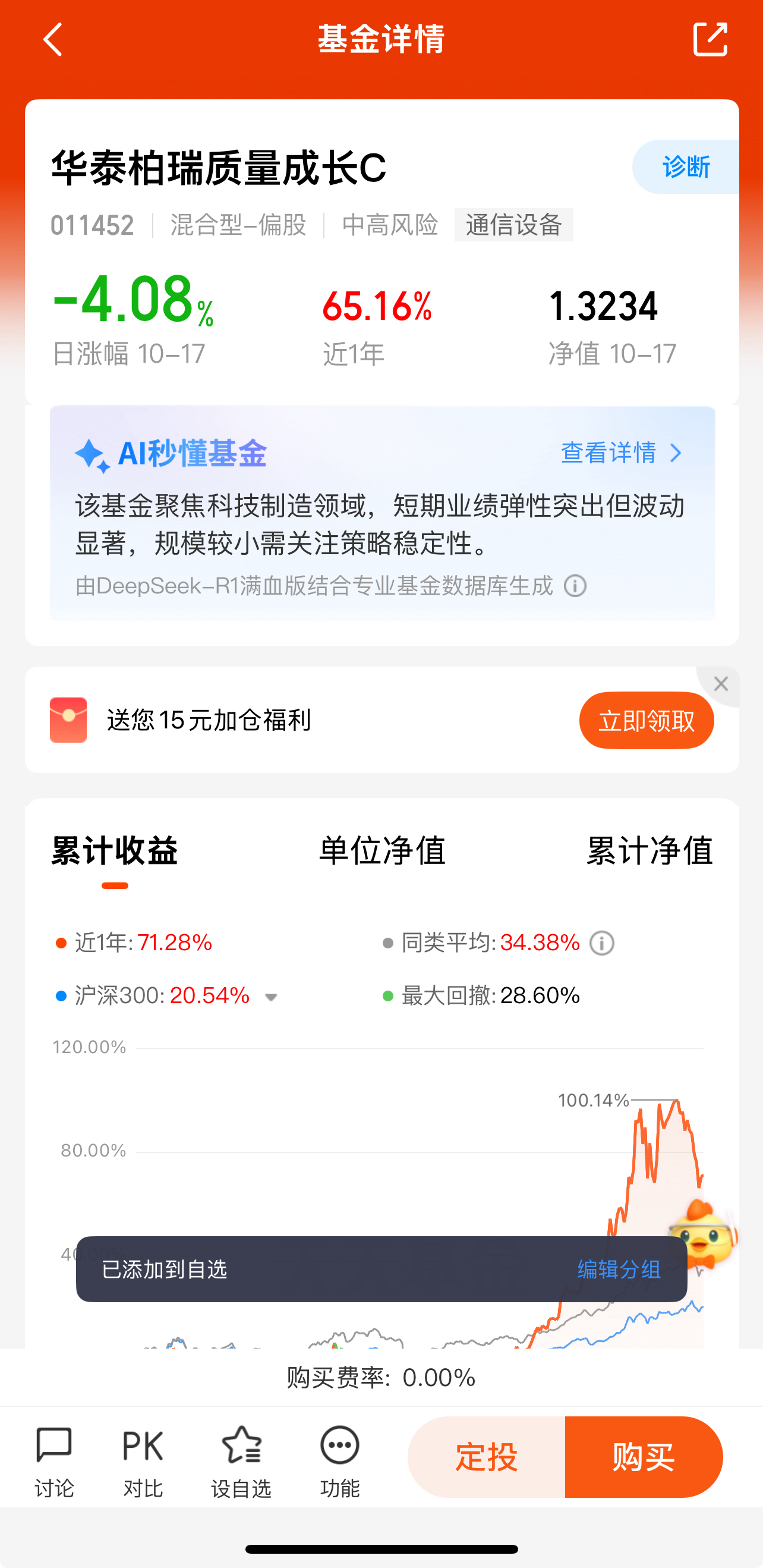 各位理财达人们,今天咱来唠唠华泰柏瑞质量成长混合C(011452)这只基金,看看它到底香不香。骑牛看熊刚好持有并看好它哟!