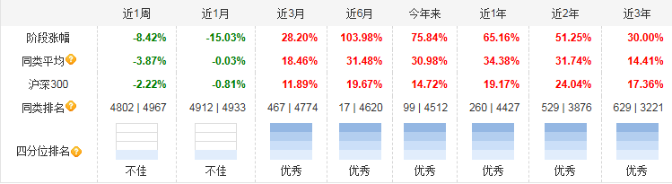从近期数据来看,近1年收益达65.16%;近2年收益达51.25%;近3年收益达30%,这种短期内的大幅上涨,显示出基金较强的爆发力。近3月收益达28.2%,近6月收益达103.98%,这一数据相当亮眼,说明在近一个月内基金的表现非常出色,可能是抓住了市场的某些投资机会,或者是其重仓股在这段时间内表现优异。