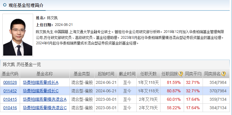 陈文凯,硕士毕业于上海交通大学,本科毕业于中国科学技术大学;2016~2019 年任中金公司研究部分析师,2019 年 12 月加入华泰柏瑞基金,历任研究员、基金经理助理,2024 年 1 月起独立管理华泰柏瑞质量精选混合基金,2024 年 7 月起独立管理华泰柏瑞质量成长混合基金。