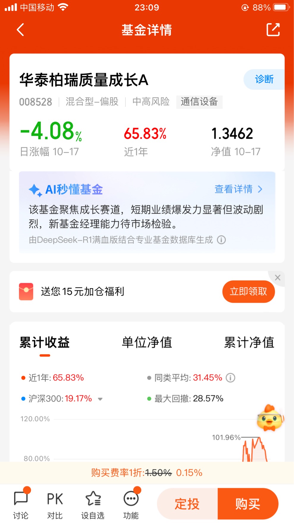 截至2025年10月17日,华泰柏瑞质量成长C近1月涨幅为14.68%,近1年涨幅为105.25%。与同类基金相比,该基金在多个阶段的表现均优于同类平均和沪深300指数,显示出较强的盈利能力。