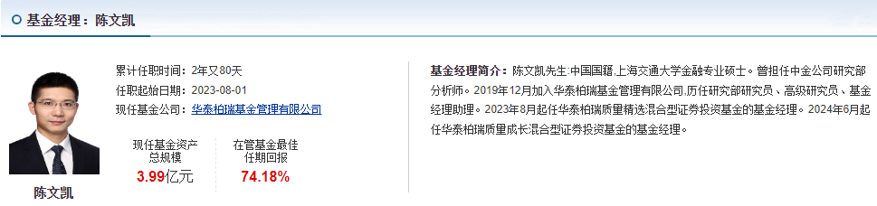 说到基金的好坏,基金经理的作用不可小觑。华泰柏瑞质量成长C的基金经理陈文凯,拥有很强的背景和丰富的经验。他之前在中金公司做过研究员,积累了丰富的市场研究经验,2019年加入华泰柏瑞基金,渐渐在多个项目中积累了管理经验。从2023年开始,他已经接管了多个基金的管理工作,并取得了不错的成绩。