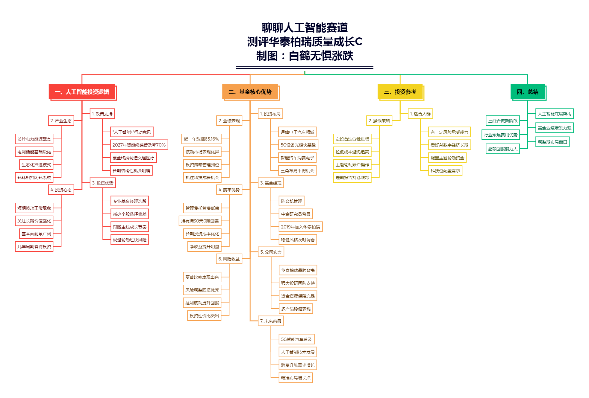 白鹤君目前是打算通过华泰柏瑞质量成长C(011452)这支基金进一步布局人工智能赛道的,接下来就跟大家一起聊聊对于人工智能板块的看法,并测评下华泰柏瑞质量成长C(011452)这支基金,希望对各位有所帮助。文章有点长,这里也是做了个思维导图,方便大家整理思路,可以点开放大了看下的。