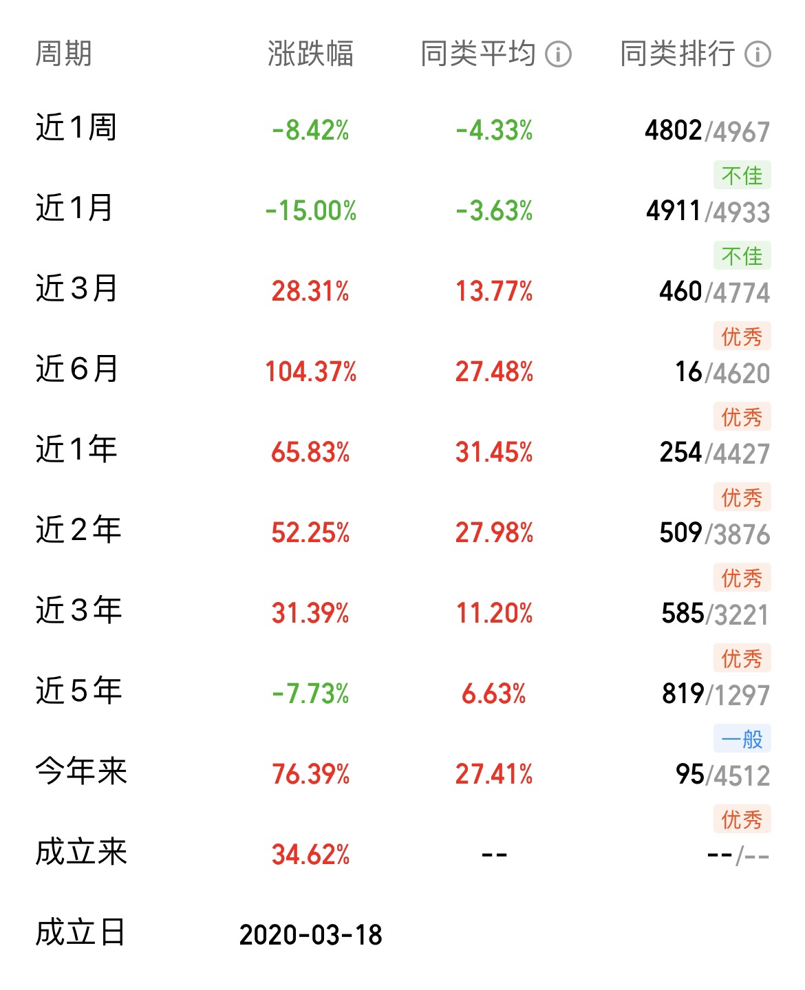 从业绩表现来看,这只基金也确实展现出了主动管理型基金在行业投资上的优势。A类份额近一年涨幅高达65.83%,而业绩比较基准只涨了18.22%,跑赢业绩比较基准47.61%,在同类4000多只产品里排到了第254位。拉长点看,从2020年3月成立以来,累计收益达到了34.62%,远超混合型基金平均水平,更是把同期沪深300指数24.15%的涨幅远远甩在后面。中长期业绩评级都是“优秀”,超额收益明显。当然,过去表现好不代表未来一定好,但至少说明基金经理在把握人工智能这条主线上,目前做得还不错。
