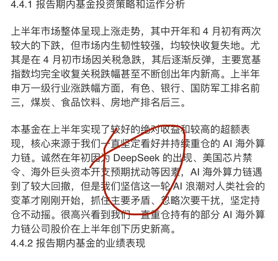 选择一只主动管理型基金,很大程度上就是选基金经理的眼光和定力。所以我个人非常看重基金定期报告里“报告期内基金投资策略和运作分析”这部分,看看基金经理是不是真的说到做到、知行合一。陈文凯经理在华泰柏瑞质量成长混合基金的2025年二季报中就明确写道:“我们一直坚定关注并持续重仓的AI海外算力链。诚然在年初因为DeepSeek的出现、美国芯片禁令、海外巨头资本开支预期扰动等因素,AI海外算力链遇到了较大回撤,但是我们坚信这一轮AI浪潮对人类社会的变革才刚刚开始,努力抓住主要矛盾、忽略次要干扰,坚定持仓不动摇。在二季度看到部分AI海外算力链公司股价创下历史新高,并且这一轮的上涨可能不是简单的反弹和估值修复,而是逻辑的反转,AI叙事的确信度大幅提升,市场对其的能见度也将从当下的1~2年延伸至未来的3~5年。此外,我们也将持续关注国产AI链的机会,中国不会缺席这轮AI浪潮,更多是节奏先后。” 这种在波动中坚守核心逻辑、着眼长远的定力,正是投资AI这种高波动高成长板块所必需的。