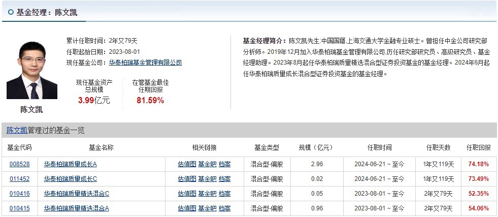 当然,买主动基金,本质上就是“雇”一位基金经理帮你打理投资。这只基金的掌舵人是陈文凯经理经理。他的履历让我比较放心:上海交通大学科班出身,9年的证券从业经验,这份沉淀不是虚的。他先是中金做研究员打好了基础框架,自2019年加入华泰柏瑞基金后,更是从研究员、高级研究员、基金经理助理一步一步脚踏实地做起。2023年开始接手管理华泰柏瑞质量精选混合基金;2024年开始接手管理华泰柏瑞质量成长混合基金。