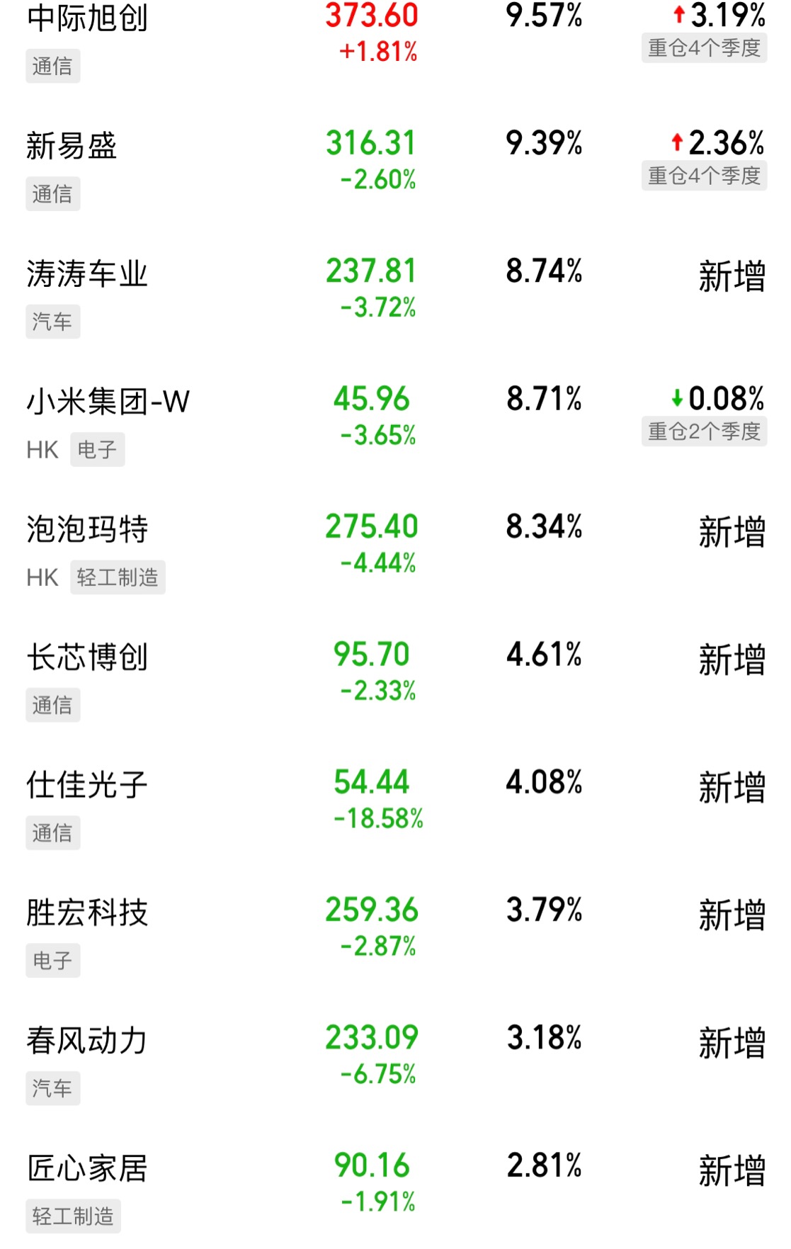 市场给陈文凯经理贴的标签是“紧抓主线、擅长抄底”。回看他过去的操作,确实很有章法:在2023-2024年,那时候AI赛道其实还没像现在这么火爆,甚至很多人觉得有点“内卷”看不到头,他却敢于在低位果断布局,结果成功踩准了行业起飞的节奏。他有个很鲜明的思路,叫“低位挖掘预期差”,通俗点说,就是特别擅长在某个板块还“无人问津”、大家都不看好的时候,去发现潜在的投资价值。这从他近期的调仓动作(如卖出部分前期涨幅较大的标的如太辰光、寒武纪,买入涛涛车业、胜宏科技等)也能看出其动态优化组合的思路。
