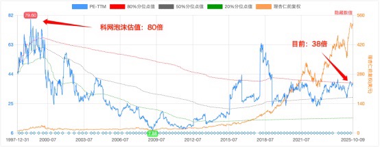 再看微软。科网泡沫顶点时估值80倍,如今涨了这么久,也不到40倍,远没有达到泡沫顶部的估值水平。所以,对美股那几家真正的AI龙头来说,估值不算便宜,但远未到崩溃的边缘。