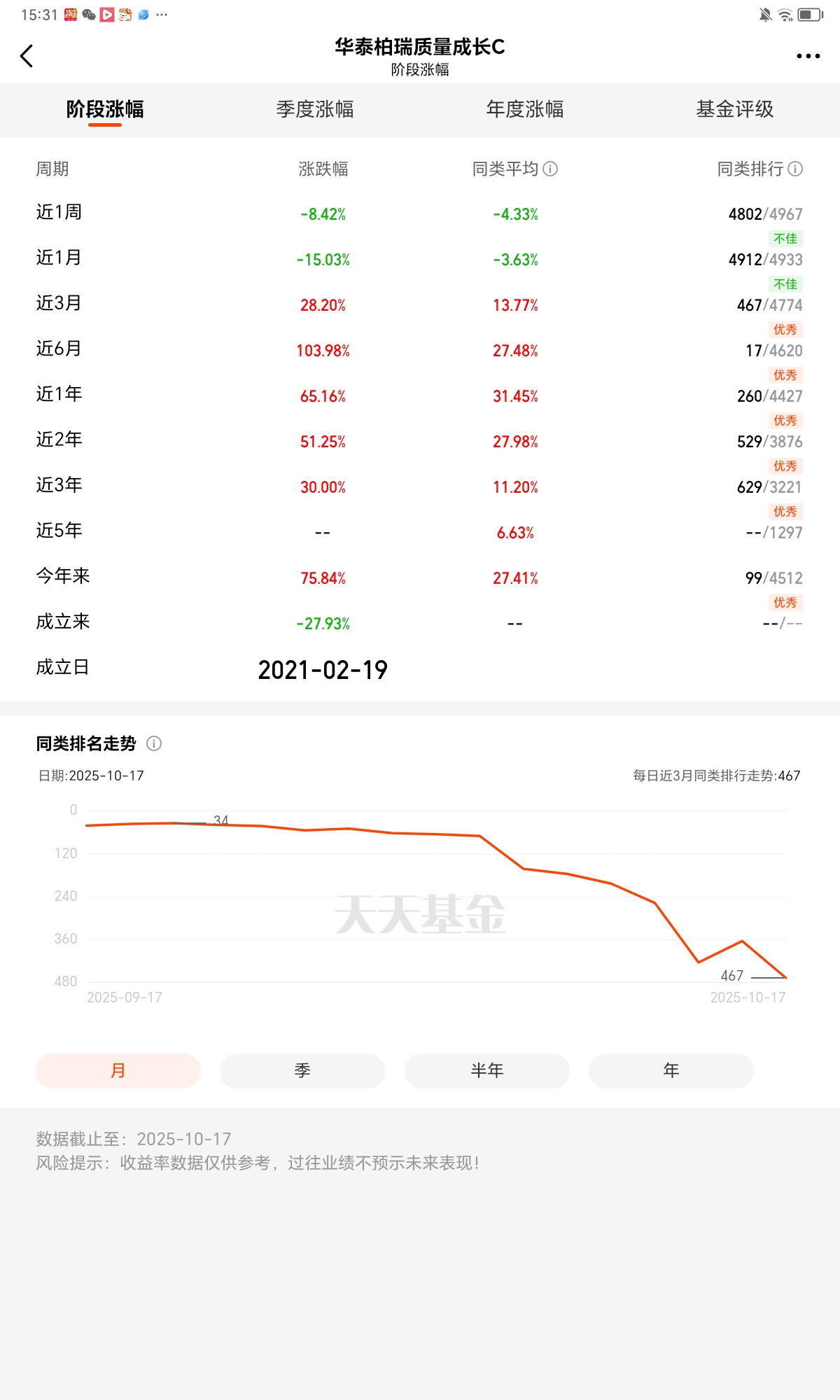 我们来看下这只基金的业绩,华泰柏瑞质量成长C目前一年收益是65%,最近6个月更猛,收益高达103%,最近3个月上涨28%,也就是说他的收益正好就是这几个月涨上去的。