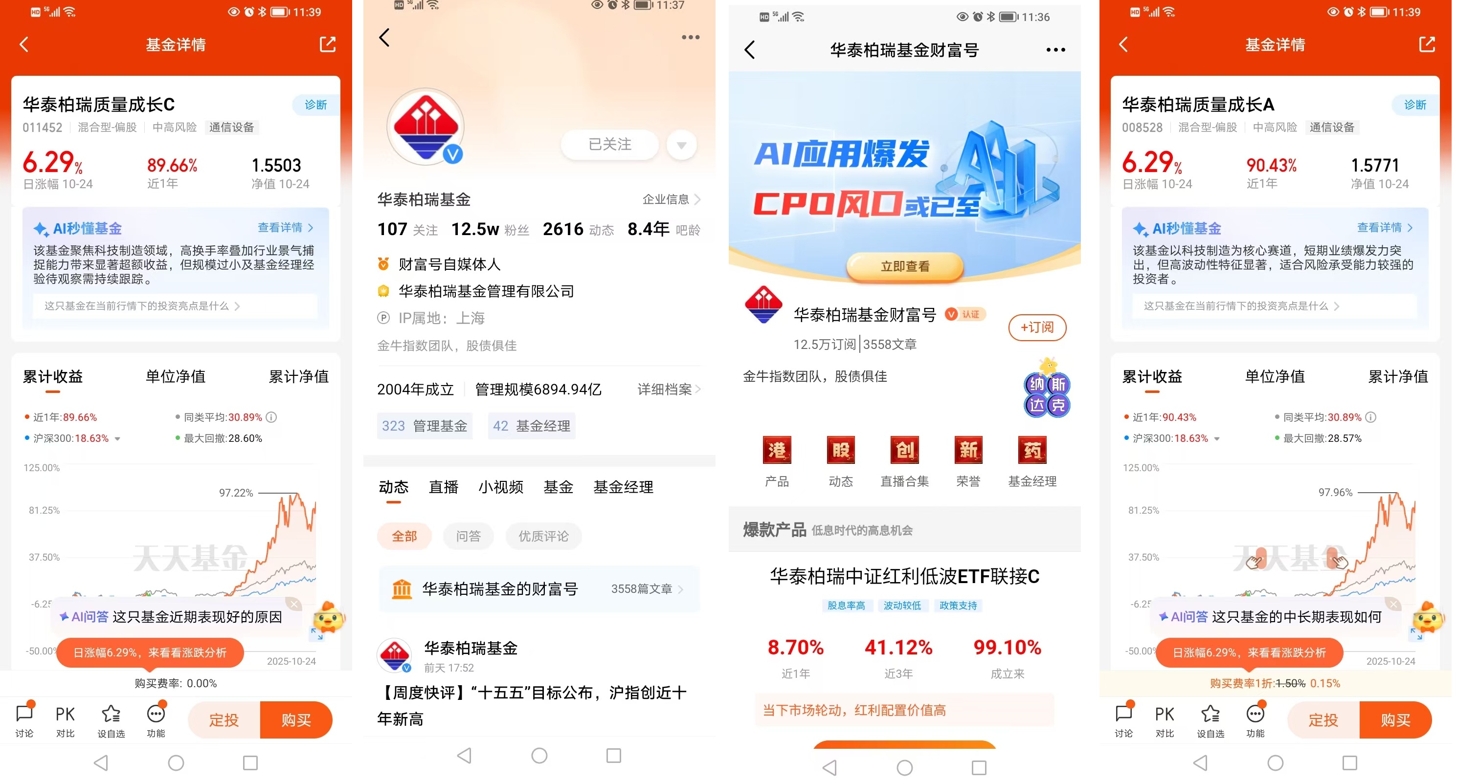 直到有天跟老领导喝酒,他说:“你不懂技术,又没精力盯盘,想赚 AI 的钱,就得找个靠谱的基金经理帮你管。” 这话点醒了我,后来翻遍了十几只基金,终于盯上了华泰柏瑞质量成长 A(008528)和 C(011452)—— 不是瞎选的,全是冲着实实在在的好处去的。
