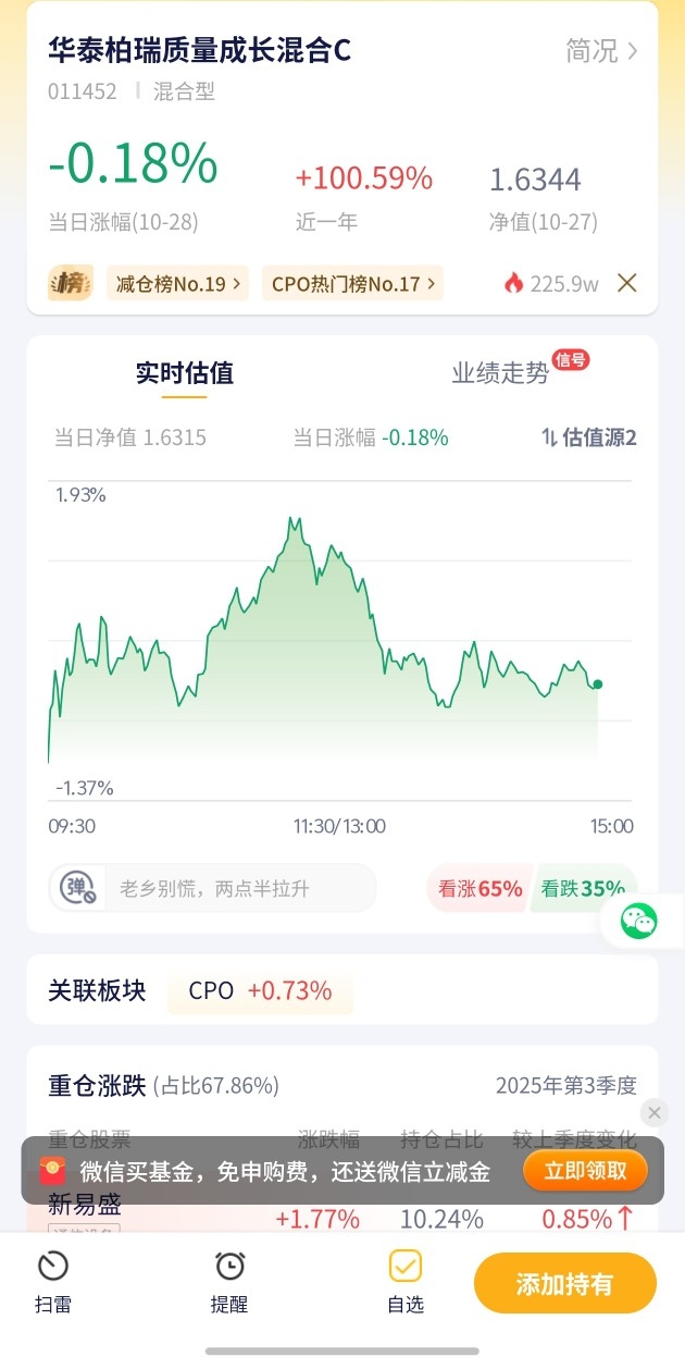 【华泰柏瑞质量成长混合C估值播报+10.28行情】