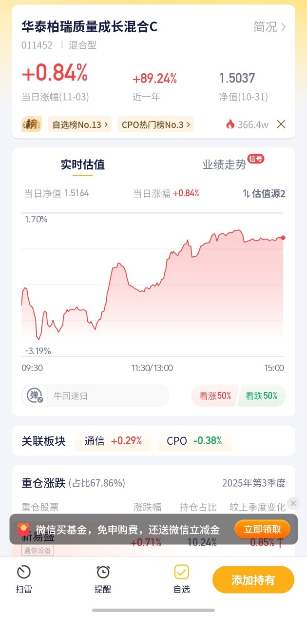 华泰柏瑞质量成长混合C今日预估涨幅0.84%!在震荡市场中逆势上涨,表现稳健,值得关注。