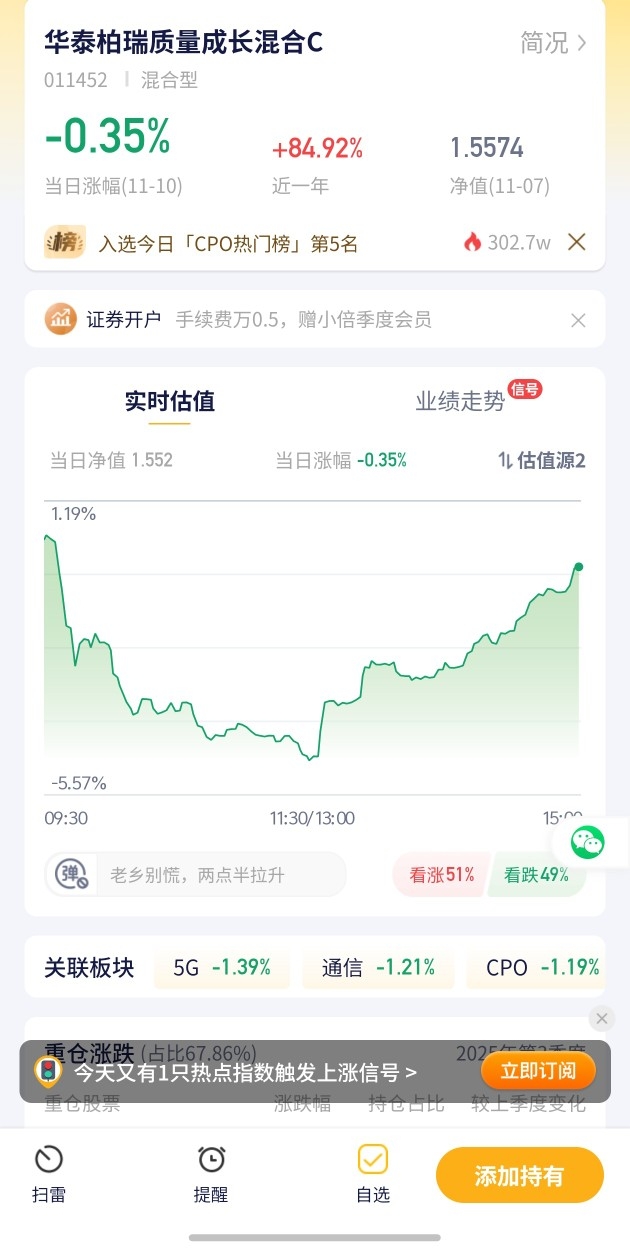 5. 【华泰柏瑞质量成长混合C估值播报+11.10行情】