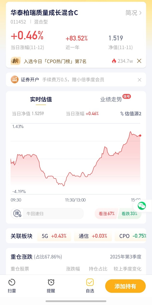 华泰柏瑞质量成长混合C今日预估涨幅+0.46%!质量成长板块表现稳健,该基金领涨自选,还不错